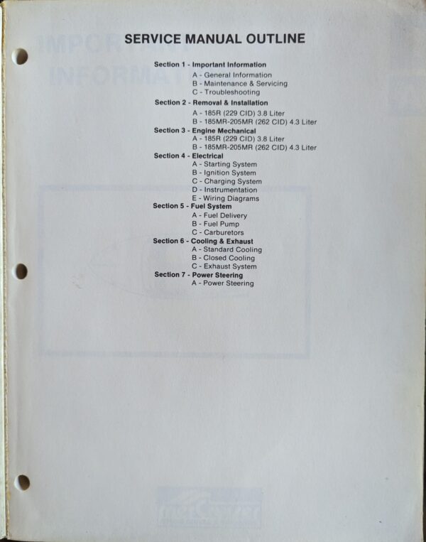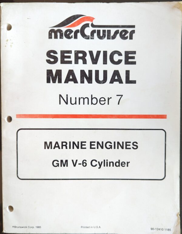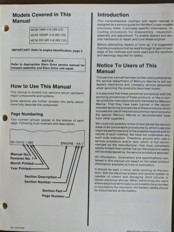Used Mercruiser Service Manual for General Motors V-6 cylinder motors (MCM 185R V-6 229CID, MC M 185MR V-6 CID, and MCM 205 ME V-6 262 CID).