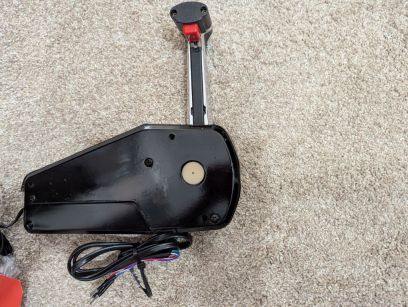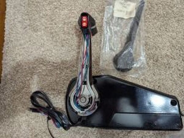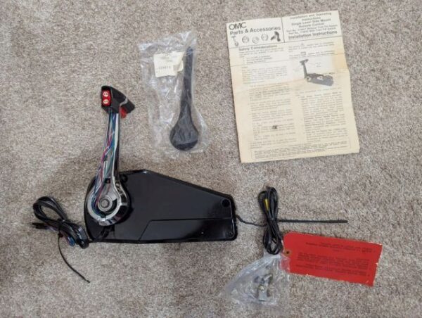 New old stock single lever surface mount control with trim for OMC, Johnson and Evinrude with installation instructions. Ignition harness is not included.