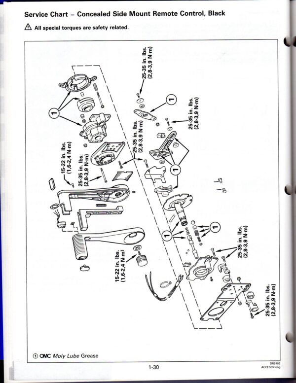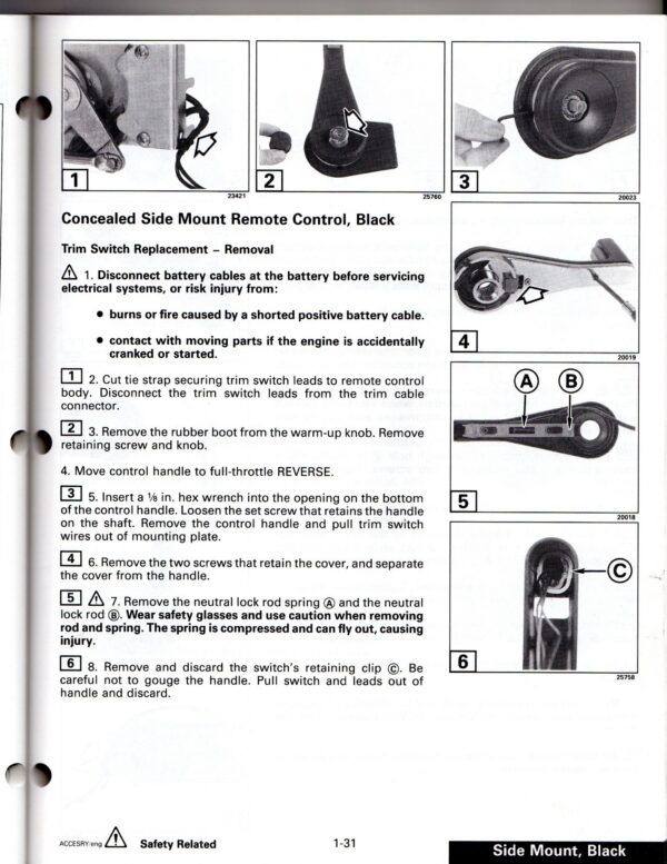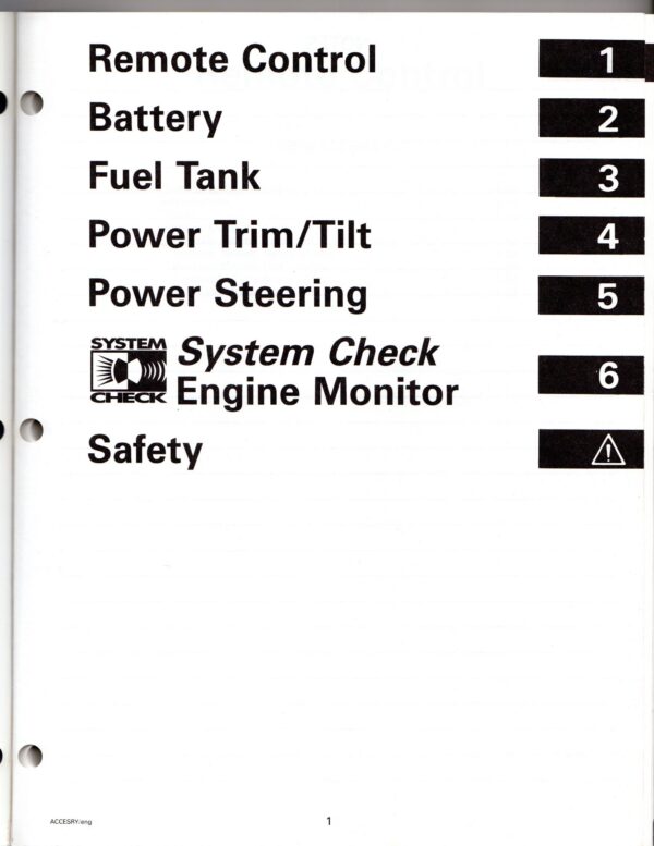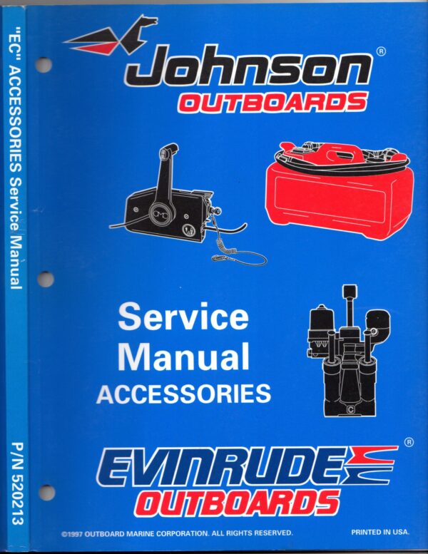 Used 1998 Johnson / Evinrude Service Manual for Accessories including: Remote Controls, Battery, Fuel Tank, Power Trim & Tilt, Power Steering, System Check Engine Monitor, and Safety sections. (see example photos). Part number 520213.